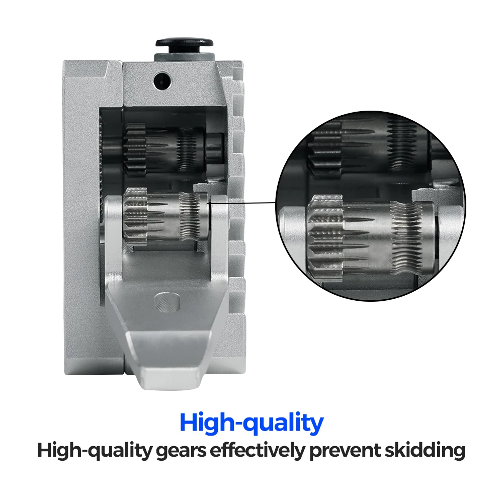 The extruder utilizes an internal gearing ratio of 3:1 together with precision cnc-machined hardened steel drive gears to give you a compact powerhouse for all your applications.Whether you require high resolution prints with small nozzles or high-flow prints with big nozzles the optimized gearing ratio combined with our industry leading drive gears provides unparalleled pushing power and lightning fast retractions in a lightweight and compact package.