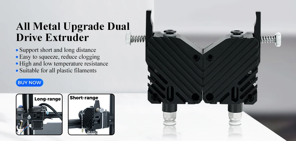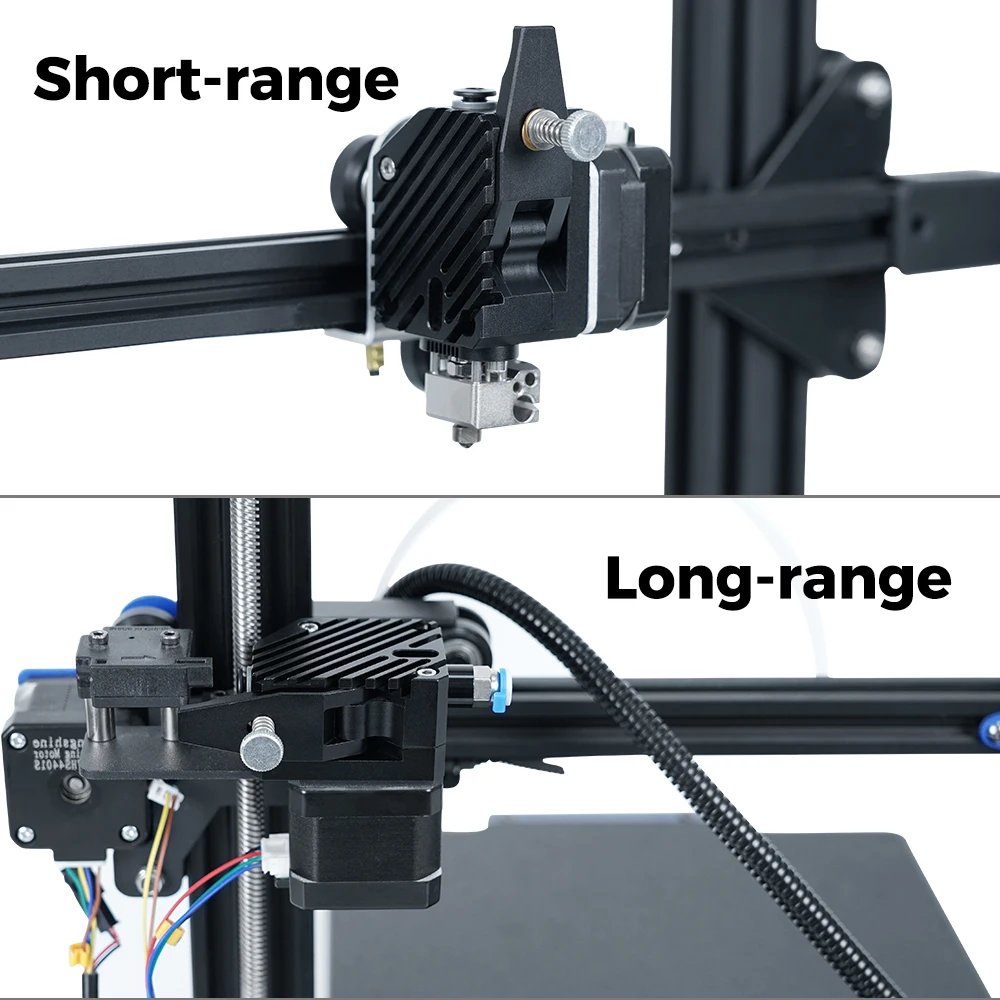 Esta extrusora se puede utilizar en impresión de largo y corto alcance, al usar Impresión de corto alcance soporta una temperatura más baja y alta temperatura. En realidad, sobre todos los filamentos de plástico como ABS,PLA,TPU,Nylon se pueden utilizar.