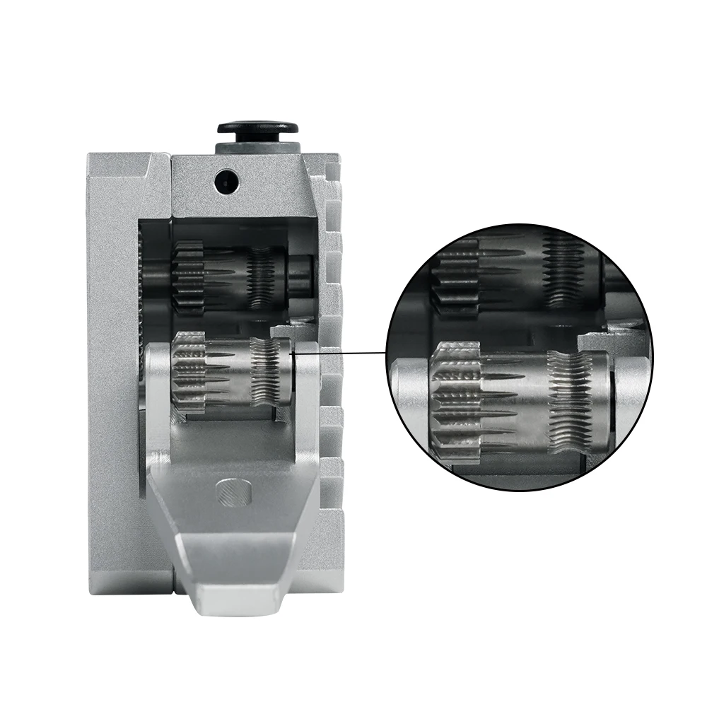 La relación de transmisión SAN es de 3: 1, Haciendo la extrusora más potente y más fácil de apretar el filamento para reducir la obstrucción y causar fallos de impresión. Si necesita impresiones de alta resolución con boquillas pequeñas o impresiones de alto flujo con boquillas grandes, la relación de engranajes optimizada combinada con nuestros engranajes impulsores líderes en la industria proporciona una potencia de empuje sin igual y retracción ultrarrápida en un ligero y. Paquete compacto.