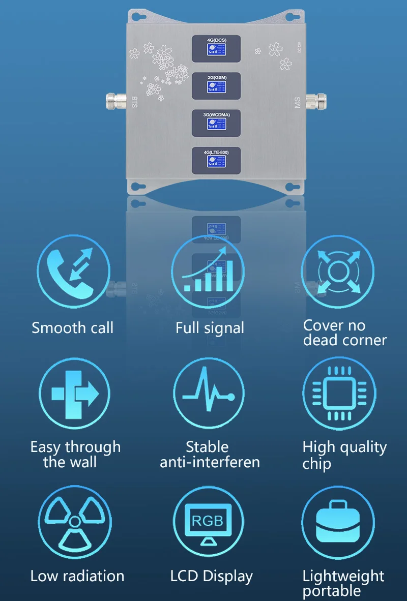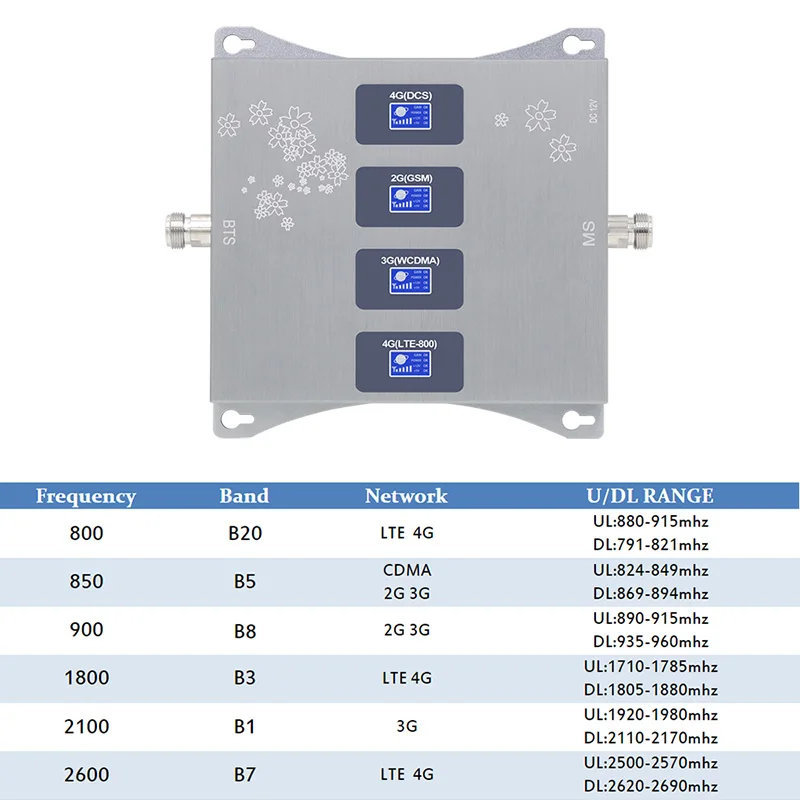 B20 800 900 1800 2100 2600MHz Four-Band Repeater Cellular Amplifier Mobile Network Enhancer 2G 3G 4G Booster+5/22dbi 4G Antenna