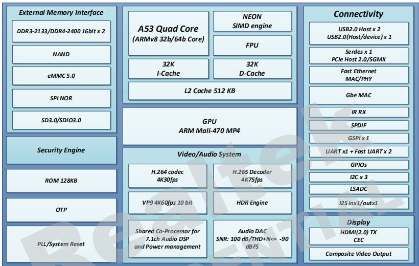 - Realtek RTD1395 ARM Cortex-A53 Quad-Core 64 Bit