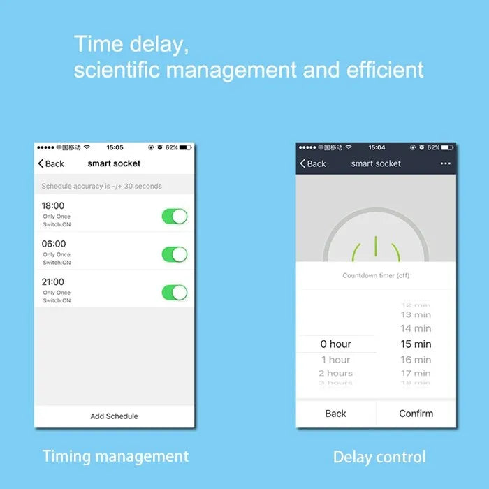 1. Control your devices from everywhere: control your plug turn on or off with your smart phone no matter where you are. Schedule your plug to turn on or off at specific time. Share the device to your family.