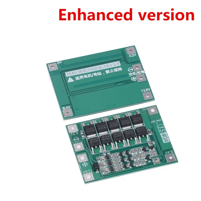 Description: Note The item is Enhanced version. Enhanced version: for starting current below 80A, power 135W below the drill.(Not balanced function) 3S 12.6V 40A lithium battery protection board Scope: Nominal voltage of 3.6V, 3.7V lithium battery (including 18650,26650, polymer lithium battery) Product Size: 42 * 55 * 3.4mm (Standard Version / Enhanced Version), 42 * 60 * 3.4mm (Balanced version) Product weight: 8.8g (standard / enhanced version), 9.8g (balanced version) Charging voltage: 12.6V - 13.6V Continuous discharge current (upper limit): 40A (if the cooling environment is not good, please reduce the load current use) Continuous charge current (upper limit): 20A Note 1: The successful start of the drill requires three 15C-20C power battery, or six 10C-15C power battery (ordinary 18650 can not start the drill!!). Note 2: strictly according to map wiring 0V, 4.2V, 8.4V, 12.6V, do not deliberately short circuit. Note 3: When the load of the brush motor is used, try to connect a non-polar capacitor (withstand voltage above 25V, capacity 10uF-100uF) to the motor's positive and negative terminals to prevent the reverse spike from the motor. Break the MOS tube. Note 4: 3 groups of batteries in series, please ensure that the voltage of each group of batteries, if not the same, please fill each battery separately and then use in series. The The Discharge test, the voltage drop faster battery that group is poor battery. For some of the poor basis of electronic customers to explain: balanced charge is only auxiliary functions, try not to put a good battery and poor battery mixed together! 3 sets of battery capacity / resistance closer to the better! (2 good battery +1 Poor battery use effect = 3 poor battery use effect).