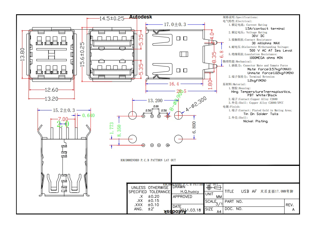 Custom 10Pcs Double USB Type A Female Solder Jacks Connector PCB Socket USB-A type 180 Degrees Vertical 4pins Manufacturer