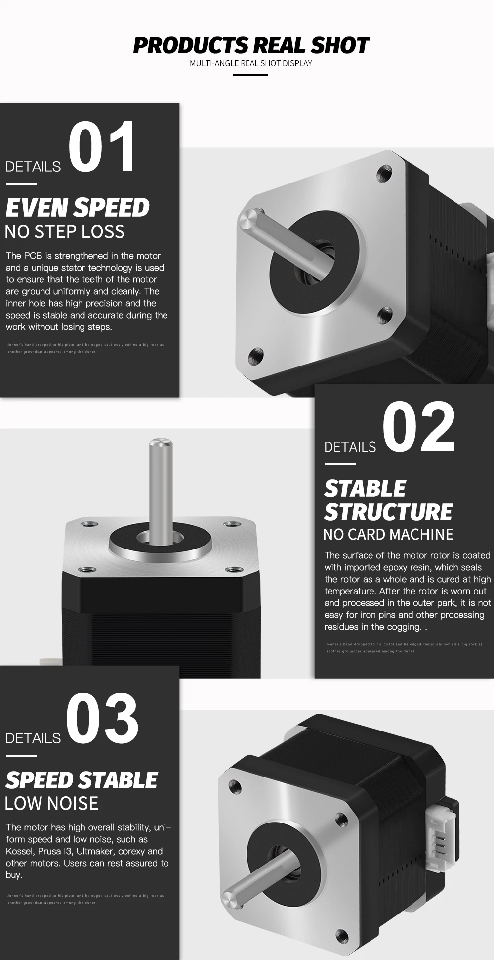 3D printer motor Description:T-Trees is an innovative high-tech enterprise that provides production and sales of 3D printers, involving 3D printers, accessories, consumables, and spare parts, to fully meet the needs of different fields and regions. The products are sold in more than 30 countries and regions. For this reason, the company has also established and improved professional large-scale after-sales teams and technical team support. It not only has dedicated personnel to conduct online operation training for users, but also provides on-site commissioning, maintenance and other one-stop service.