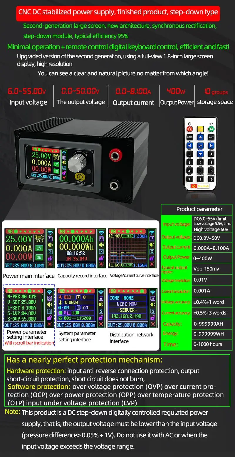 custom 1Pcs XY5008 DC step-down converter 0-50V 8A 400W power module adjustable regulated power supply WIFF APP
