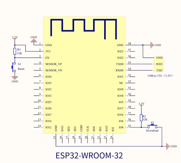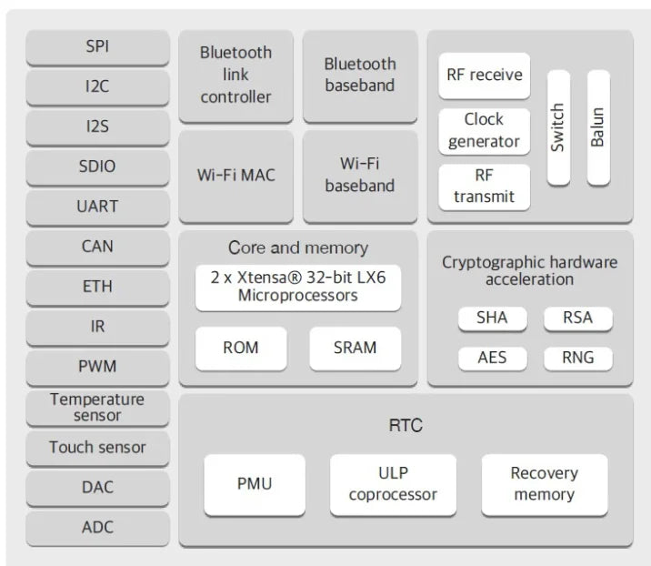 ESP32-WROOM-32 is a WiFi and Bluetooth system level chip (SoC) with industry-leading RF performance, low power consumption, and highly integrated advantages. ESP32-WROOM-32 integrates complete transmit/receive RF functions, including antenna switch, RF balun, power amplifier, low noise amplifier, filter, power management module, and advanced self calibration circuit. The self calibration circuit achieves dynamic automatic adjustment to eliminate defects in external circuits. ESP32-WROOM-32 comes with two 32-bit, LX6 CPUs, with a main frequency of up to 240MHz, and adopts a 7-stage pipeline architecture. ESP32-WROOM-32 also integrates rich analog sensing and digital interfaces.
