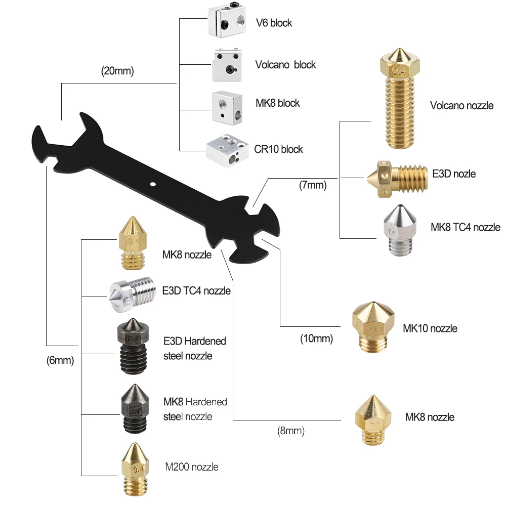 Custom 3D Printer Parts Nozzle Wrench 5 IN 1 Wrench Stay 6mm to 20mm Steel Spanner Wrench Flat For Ender 3 E3D MK8 MK10 Nozzle tool Manufacturer