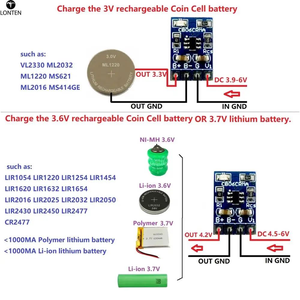 Charge the 3.6V rechargeable Coin Cell battery OR 3.7V lithium battery.