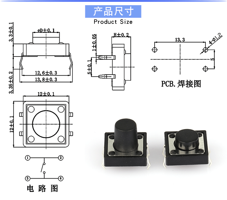 Custom 50pcs 12X12 Tact Switch DIP 4 Pin Key switch Micro switch 4P 12*12*4.3MM/5MM/6MM/7MM/8MM/9MM/10MM/12MM Manufacturer