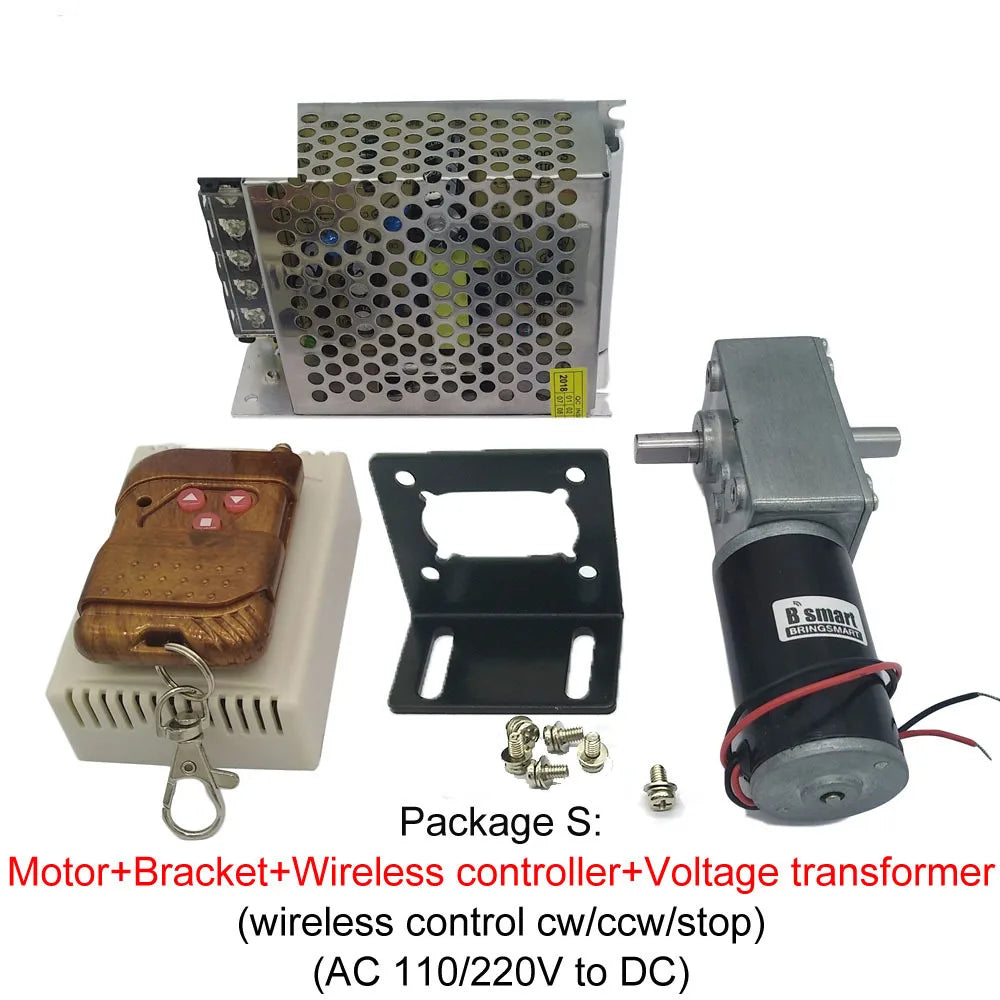 (5) 12v 12rpm+Package S, you will receive 1 piece of the motor(12v 12rpm) + Mounting bracket + Wireless controller + Voltage transformer