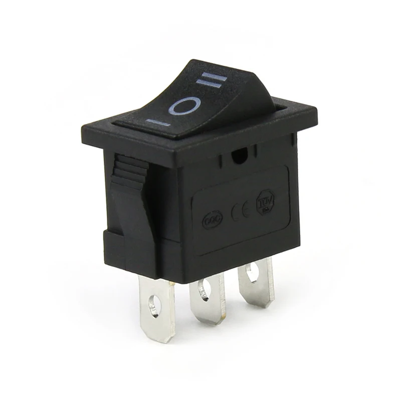 Features: single and double throw(SPDT) contact type, 3 pin terminals, on off on snap in rocker switch.