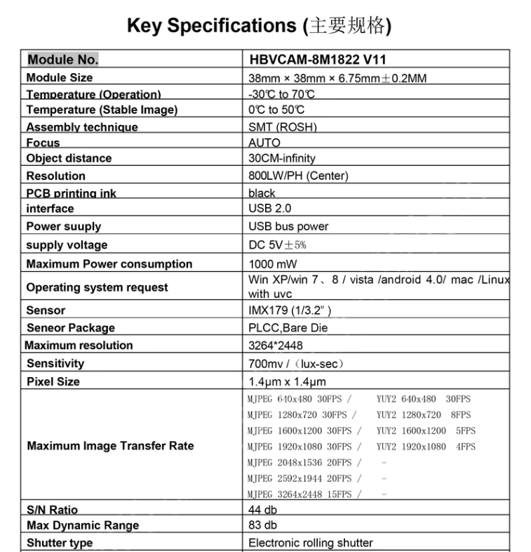 Photosensitive chip: imx179 (1/3.2 ") CMOS