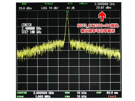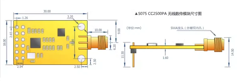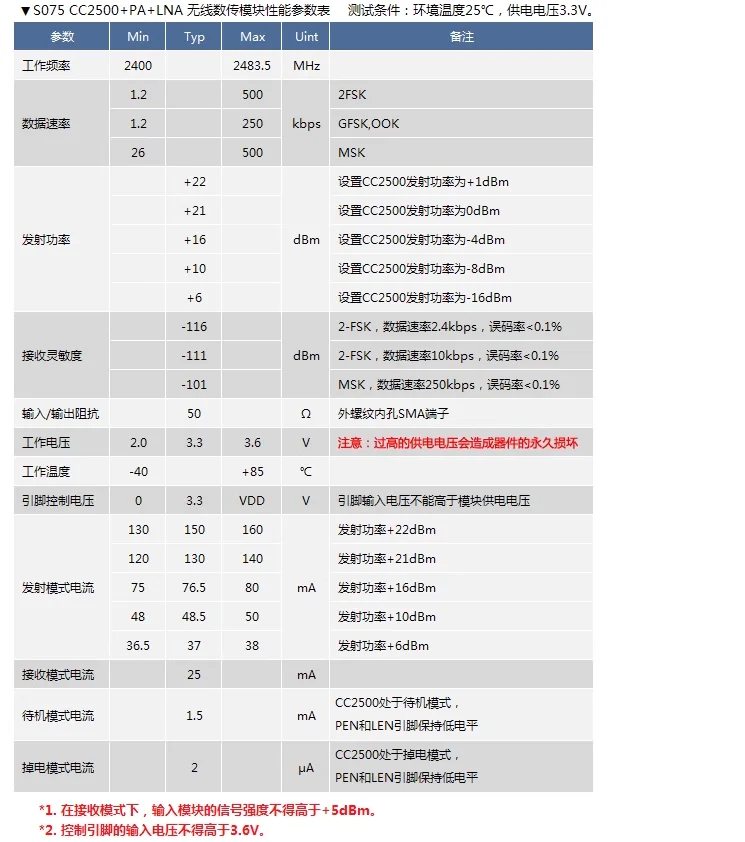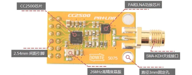 CC2500PA is a single-chip wireless transceiver that operates in the world wide ISM frequency band from 2.4GHz to 25GHz. The wireless transceiver unit uses a powerful CC2500 chip and integrates a highly integrated RF front-end chip, resulting in a maximum output power of+22dBm for this module.