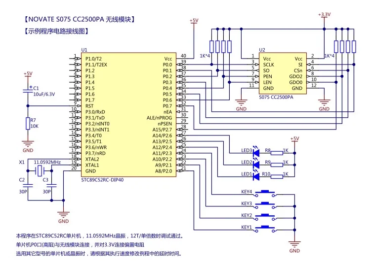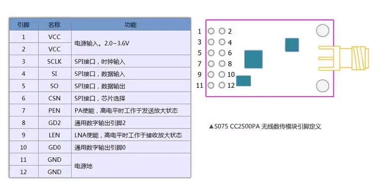 The switching and power-off of the RF front-end chip are controlled by two independent pins, while the other pins and functions are the same as those of a regular CC2500 chess block.