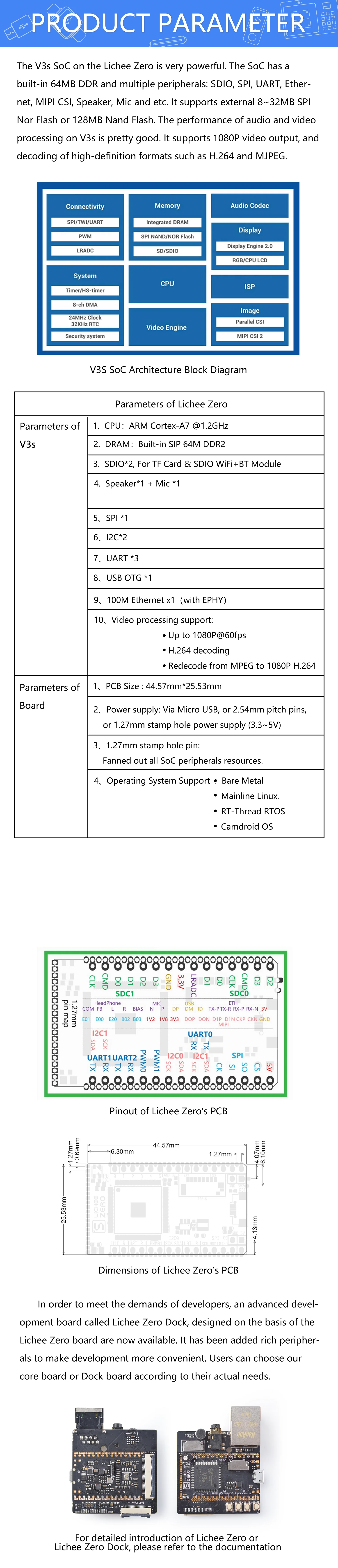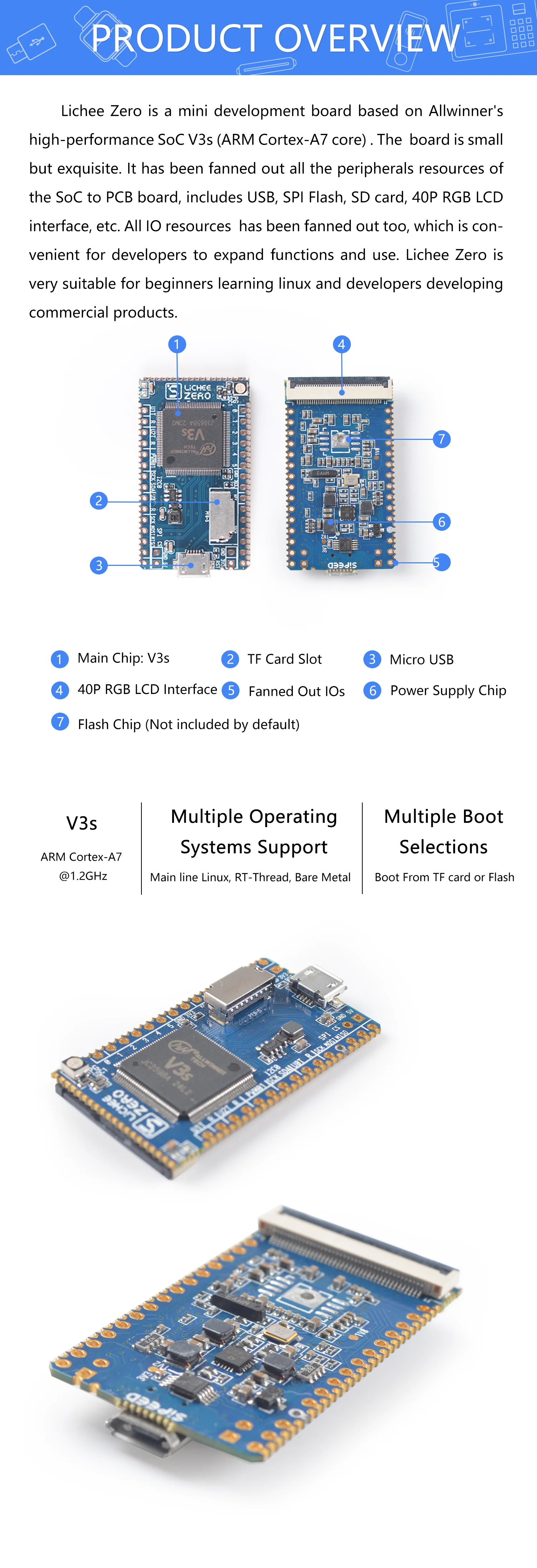 Lichee Zero is a mini development board based on Allwinner's high-performance SoC V3s (ARM Cortex-A7 core). The board is small out exquisite. It has been fanned out all the peripherals resources of the SoC to PCB board, includes USB, SPI Flash, SD card, 40P RGB LCD interface, etc. All IO resources has been fanned out too, which is convenient for developers to expand functions and use. Lichee Zero is very suitable for beginners learning linux and developers developing commercial products.