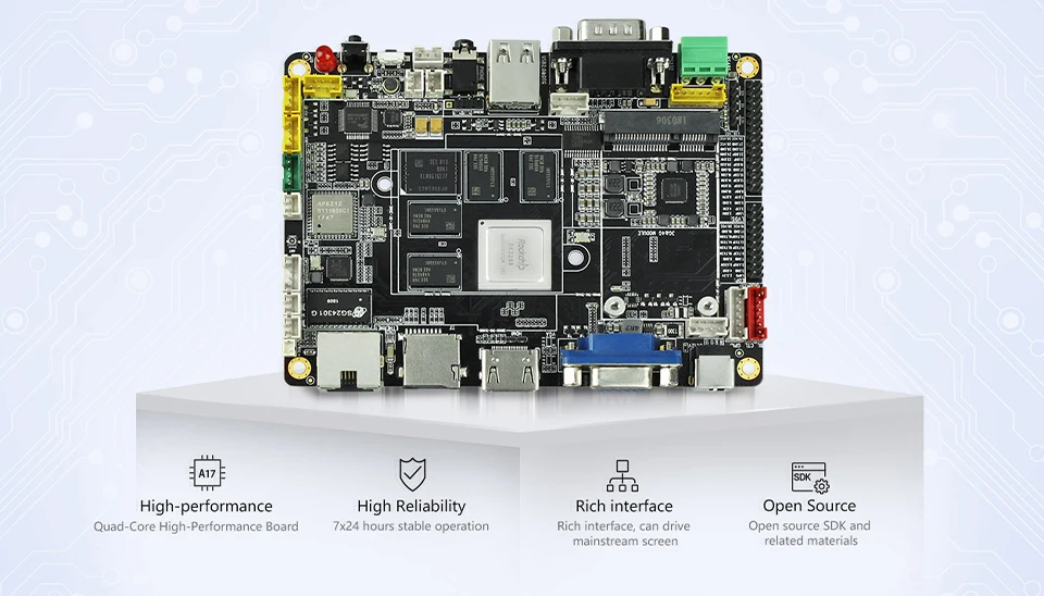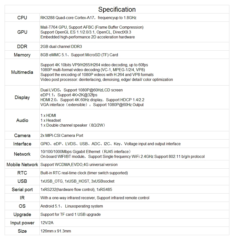 Uses RK3288 quad-core Cortex-A17processor, supports 4K hardware decoding, has a rich expansion interface, as well as compatible with mainstream displays. It adopts the immersion gold processand has passed various pressure tests, which can be applied to the productdirectly.