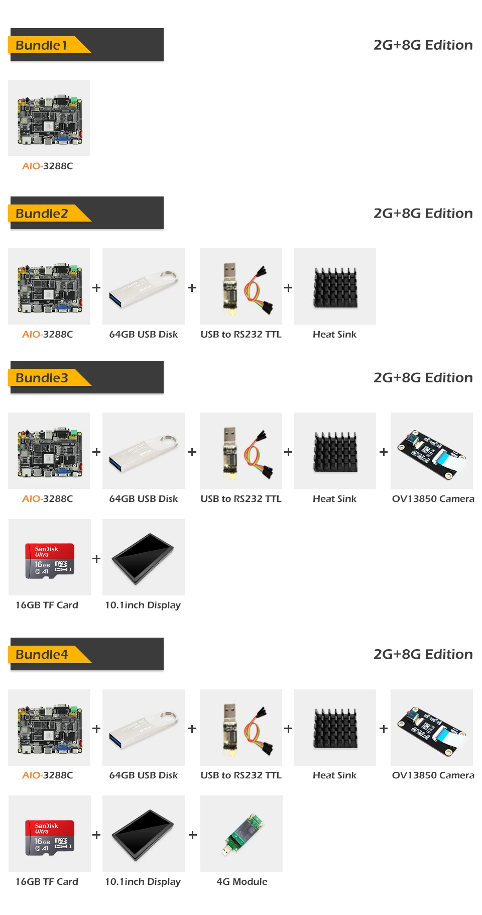 Bundle4: 2GB+8GB AIO-3288C + 64GB USB Disk + USB to RS232 TTL + Heat Sink + OV13850 Camera + 16GB TF Card + 10.1inch Touch LCD + 4G Module