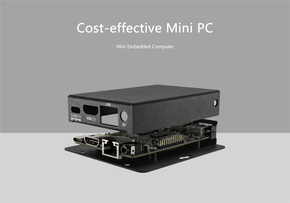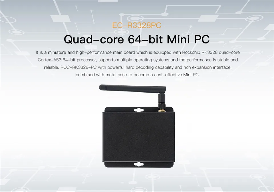 It is a miniature and high- performance main board which is equipped with Rockchip RK3328 quad- -core Cortex-A53 64-bit processor, supports multiple operating systems and the performance is stable and reliable. ROC- -RK3328- PC with powerful hard decoding capability and rich expansion interface, combined with metal case to become a cost- -effective Mini PC.