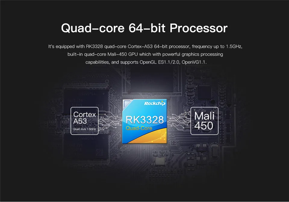 It's equipped with RK3328 quad- core Cortex- A5364-bit processor, frequency up to 1 .5GHz, built-in quad-core Mali-450 GPU which with powerful graphics processing capabilities, and supports OpenGL ES1.1/2.0, OpenVG1.1.