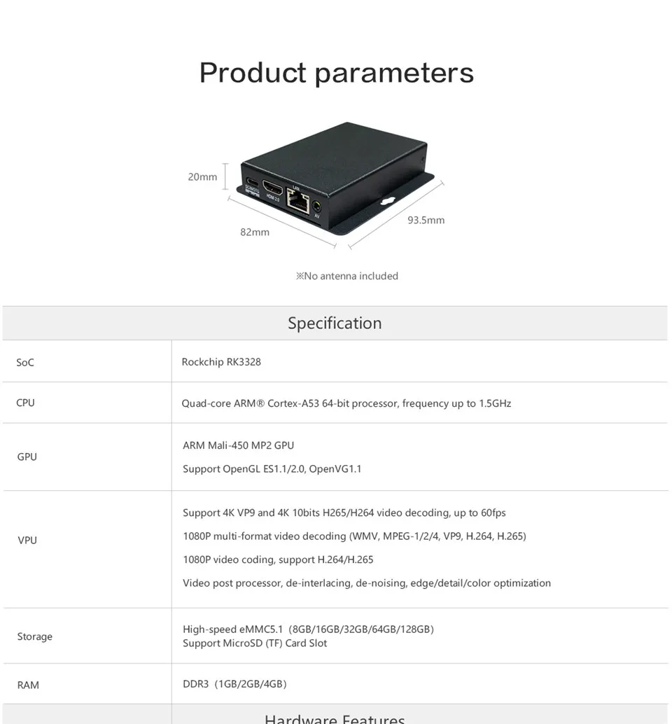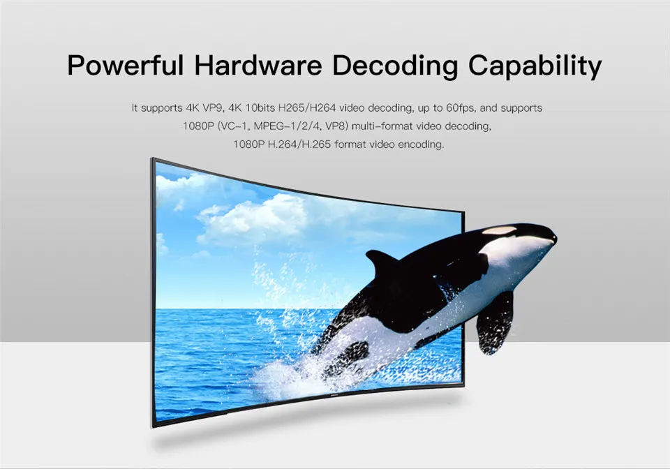 It supports 4K VP9, 4K 10bits H265/H264 video decoding, up to 60fps, and supports 1080P (VC-1, MPEG-1/2/4, VP8) multi- -format video decoding, 1080P H.264/H.265 format video encoding.