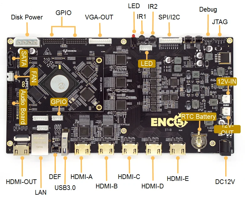 Product features Ultra-clear input, high performance, high configuration, customizable, expandable 4K-HDMIx5 8x1080P or 2×4K simultaneous real-time encoding and decoding 2GB DDR3256MB Nand Flash Open source system supports secondary development, expandable touch screen audio board, battery pack, etc. Interface layout performance parameters Core performance Main chip: Hi3531DV100 CPU: ARM Cortex A9 dual-core @1.4GHz Memory: 2GB DDR3 Flash: 256MB Nan