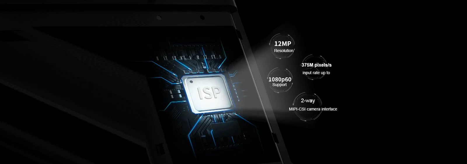 2. Dual Image Signal Processor (ISPs): Resolution up to 12MP and input rate up to 375MPixels/s;