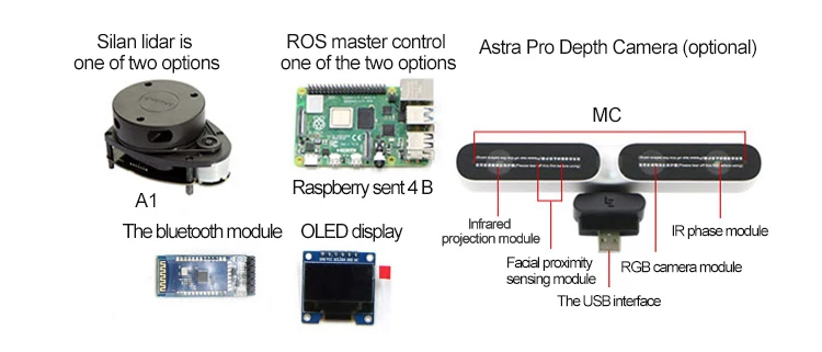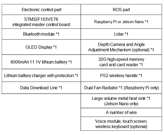 Drive structure:Can freely switch positive Ackerman Anti-Ackerman, differential structure The wheel:Drive wheel:65mm rubber wheel Slave wheel: 60mm metal omni-directional wheel The steering gear:311920KG high torque digital steering gear Size: 240.5*191*146 The car weight:1.8kg Load capacity:3kg Maximum speed:1.2m/s Light load range(Speed 0.45m/s):5.5h The load lasts for 1kg(Speed 0.45m/s):4h The motor:MG513 motor The encoder:AB phase high-precision photoelectric encoder with 500 wire The control mode:APP, PS2 wireless gamepad, CAN, sernial port, etc STM32 master:STM32F103VET6 Laser radar:Silane A1 standard version ROS master:Raspberry Pi 4B (2G+32G) Depth camera: ASRTA Pro RGBD Depth Camera The operating system:STM32 is equipped with Freertos ROS and Ubuntu 18.04+ Melodic data:Full series of development manuals, video tutorials ROS source code, STM32 source code, ROS mirror
