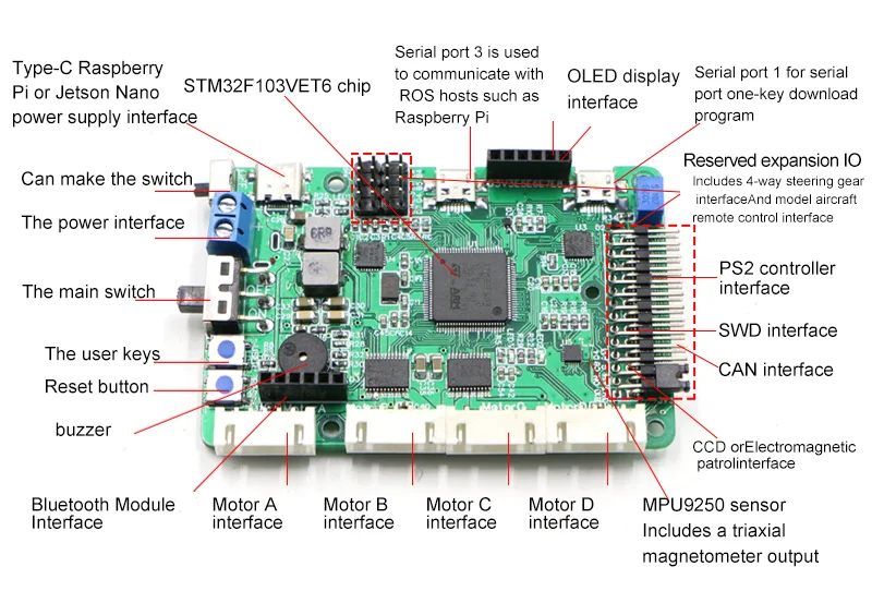 The motherboard is reserved for PS2 handle receiver socket Speed and steering can be controlled using the PS2 joystick, and speed can be stepless adjusted through the joystick