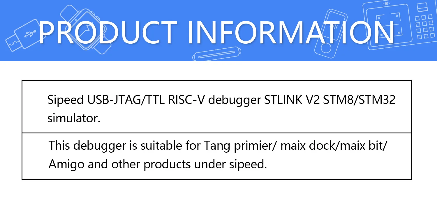 Sipeed USB-JTAG/TTL RISC-V Debugger STLINK V2 STM8/STM32 Simulator. Support full range of STM32 SWD debugging interface, simple 4-wire interface (including power supply), fast and stable; interface definition nterface shell directly marked! This debugger is suitable for products such as sipeed's Tang primier/maix dock /maix bit/ MAIX go.
