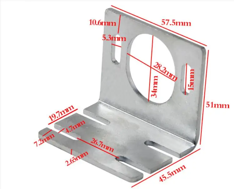 N.W.Weight: 0.1kg Type: U-Shape/Standard Surface: Electroplating Materials: High Strength Steel Vertical Plane: thickness 6mm/0.24inch, height 69mm/2.72in Baseboard: app.61mmx68mm/2.4in x 2.68in Motor mounting hole: 5.5mm Package includes: 1x Motor Bracket 4 x Nuts 4 x Screws Please allow 0-3mm error due to manual measurement. pls make sure you do not mind before you bid.