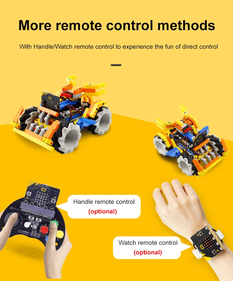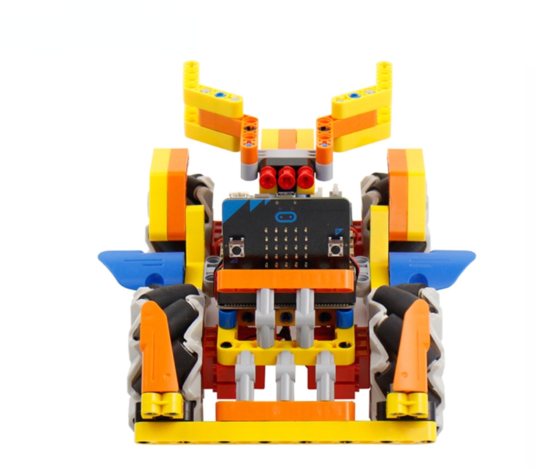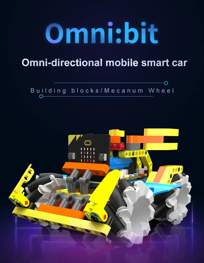 Deze Omni-directionele mobiele smart auto is gemaakt van 146 blokken, 4 bouwstenen motoren en 4 Omni-directionele wielen. Met de Super:bit uitbreidingskaart met krachtige motor drive vermogen, met MakeCode grafische en Python programmering, het kan gemakkelijk zijn 360 ° omnidirectionele beweging door slepen de bouwstenen. Omdat het is uitgerust met een hoge-kwaliteit Mecanum wiel, het kan snel advance in acht verschillende richtingen: voor, achter, links, rechts, linksboven, linksonder, rechtsboven, en rechtsonder. De mogelijkheid om obstakels te vermijden is veel groter dan Andere smart auto's. Daarnaast kunnen we ook controle het via de Android/iOS dual systeem APP controle of micro:bit handvat bereiken andere functies trouwens omnidirectionele bewegingen, zoals: kleurrijke verlichting, muziek en dus op