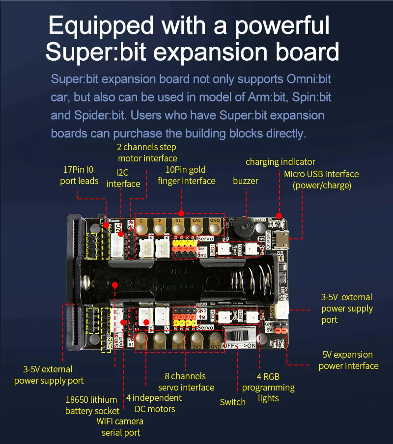 * Multi-functionele en geschikt voor building Super:bit uitbreidingskaarten voor building block programmering robots.