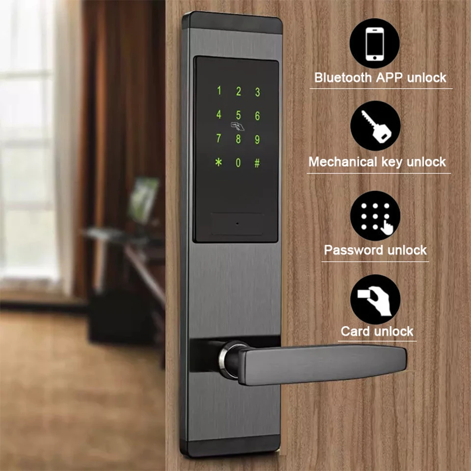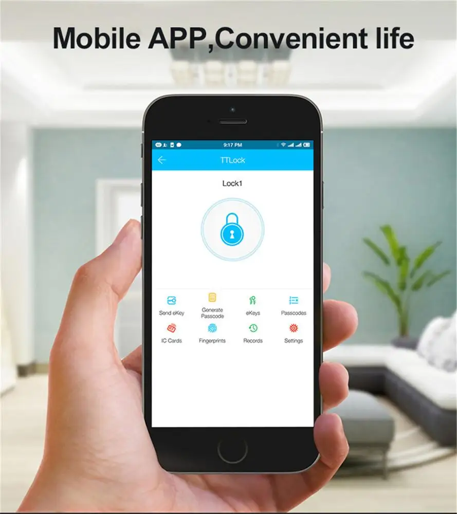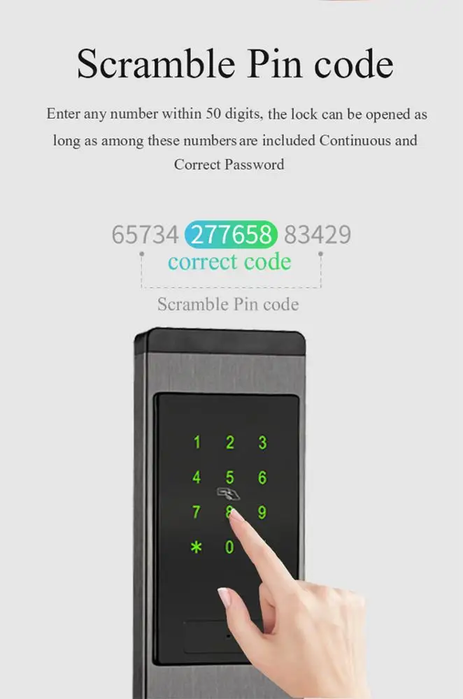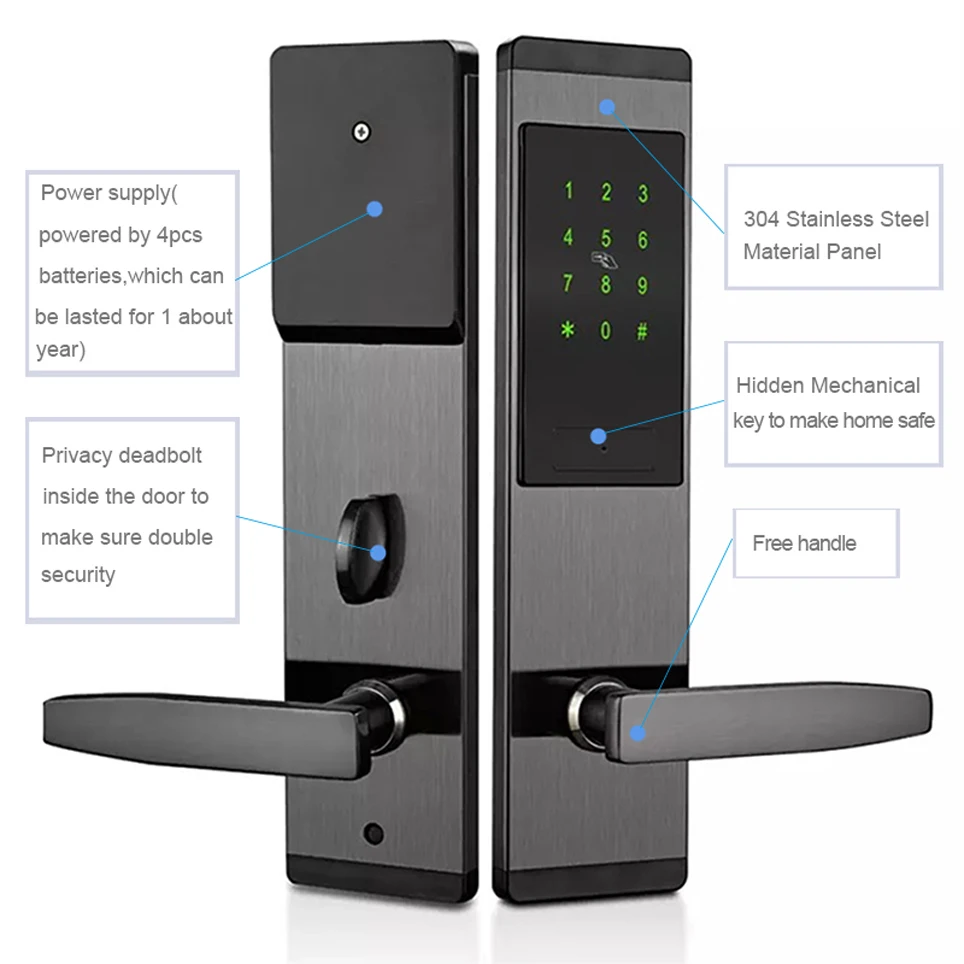 1.Unlocking method: APP ,password, RFID card, key unlock2. distance: within 5 meters3.Appearance process: baking + plating4.Password length: 6 digits/supports 16-digit dummy password5.Standby time: 13 months (15 times per day)6.Ambient temperature: -45 degrees -55 degrees7.Applicable door thickness: 38-55MM8.Cylinder grade: C9.Power supply: 4pcs AA batteries(not includes)10.Card capacity: 50 sheets11.Password capacity: unlimited12.Number of passwords: Lock the password and alarm after 5 consecutive mistakes13.System function : APP management / aging password / record query14.Low battery alarm: low power fingerprint light