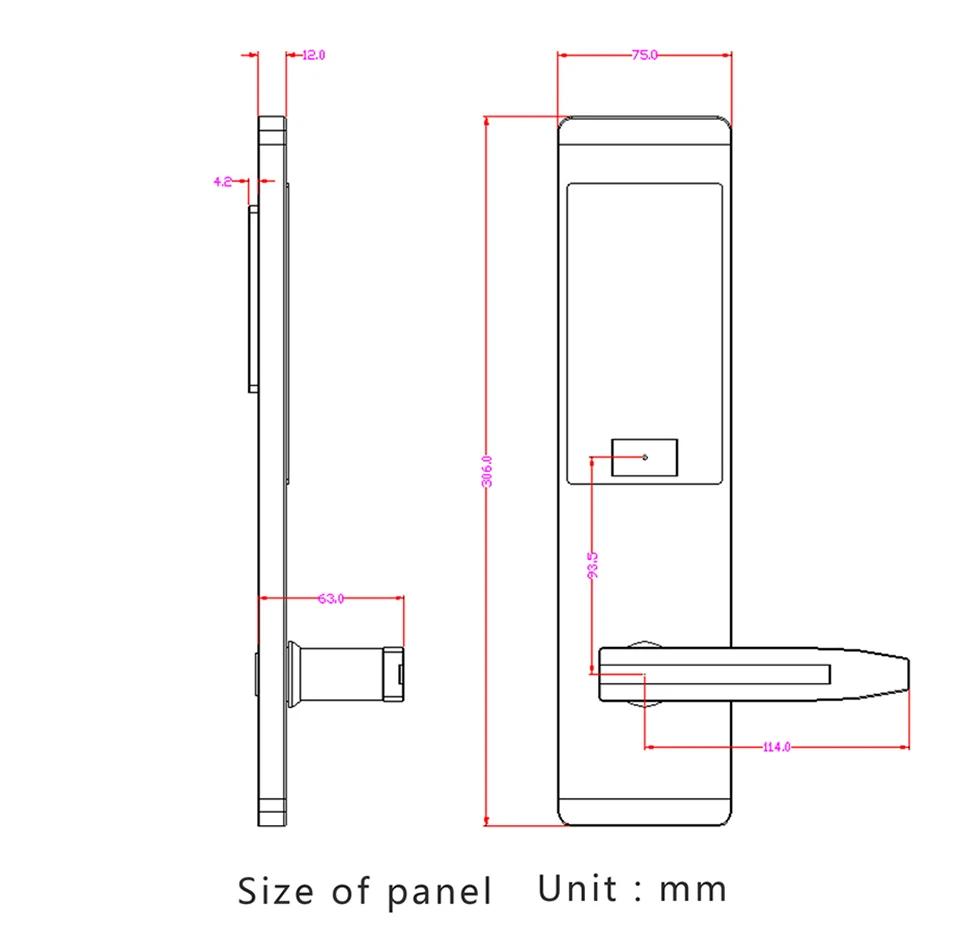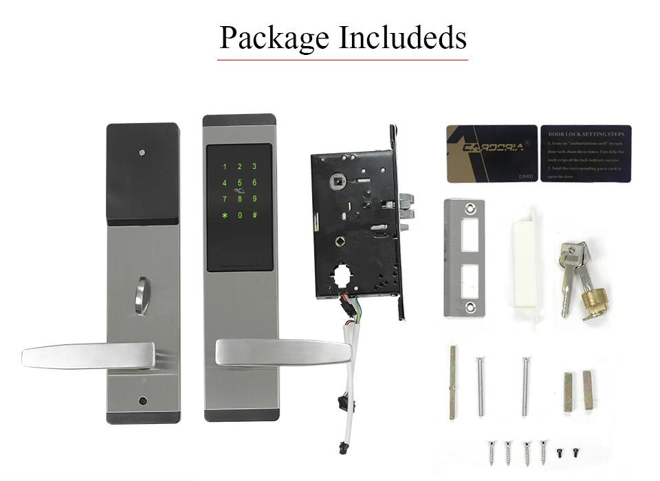 Front panel x1Back panel x 1Lock body x 1RFID card x 3Mechanical key x 2Accessories bag x 1Manual x 1Opening drawingx1