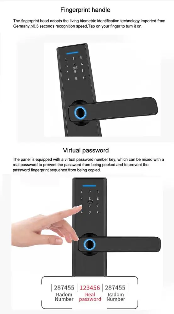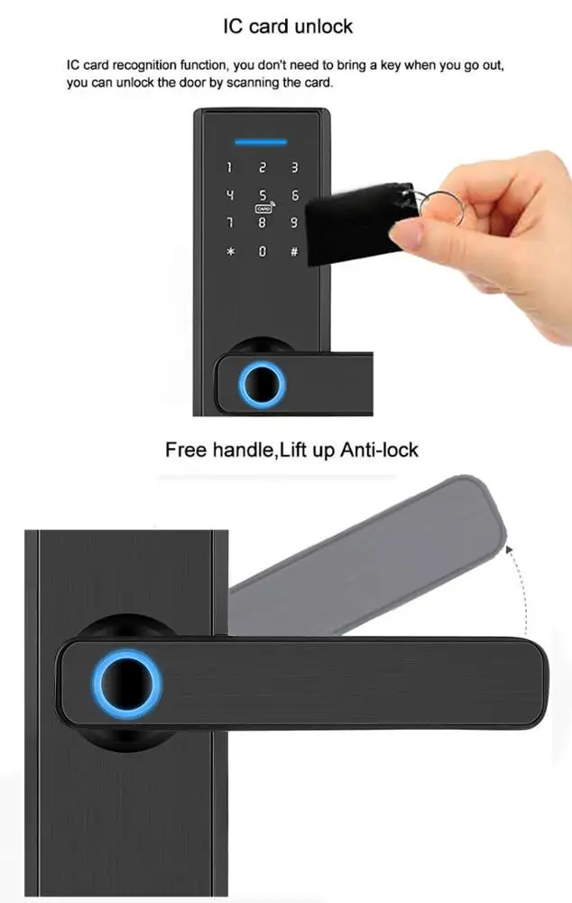 1.App/Fingerprint / Password / Smart Card / Key Unlock2.View access logs from app3.Support Normal Open Mode (access )4.Diffrence Mortise Lock Size5.English Voice6.Wire Drawing Panel7.Frosted Shell8.Universal Both for Right or Left Door