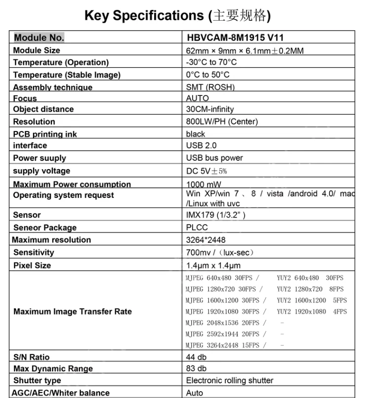 Photosensitive chip: imx179 (1/3.2 ") CMOS