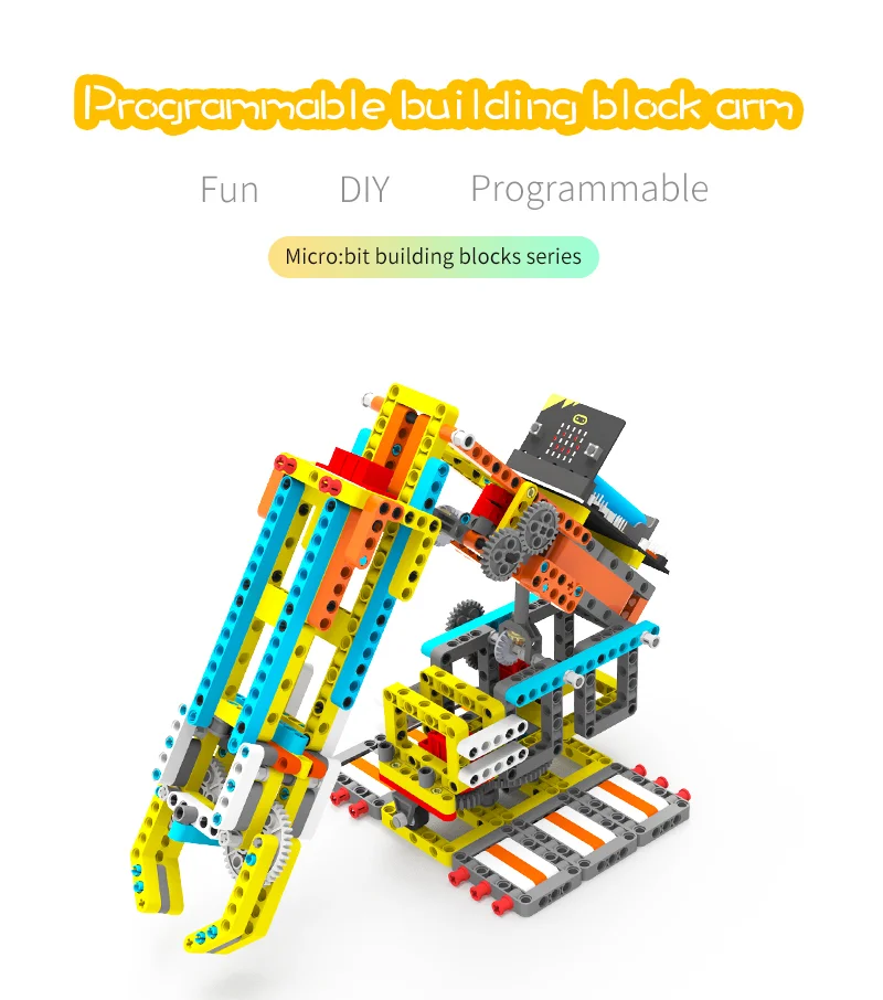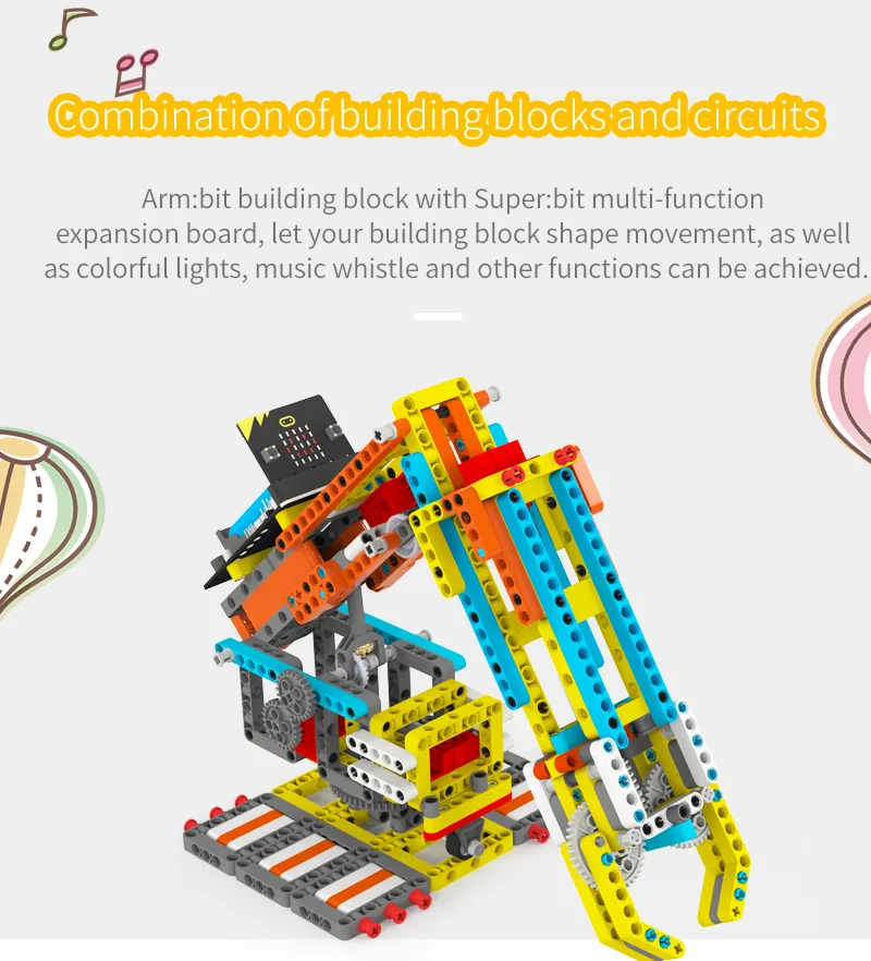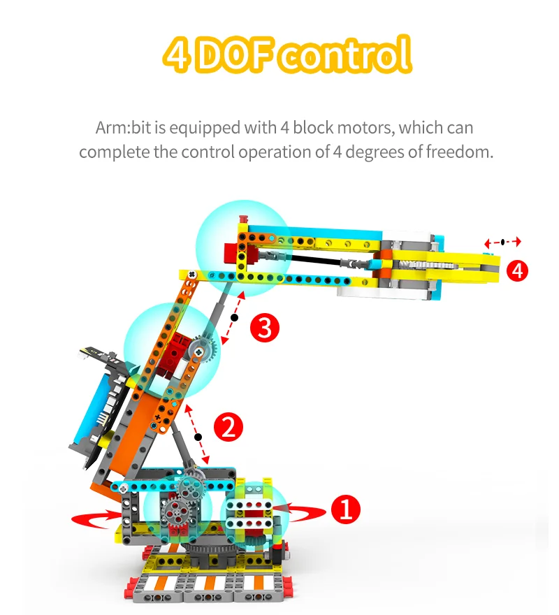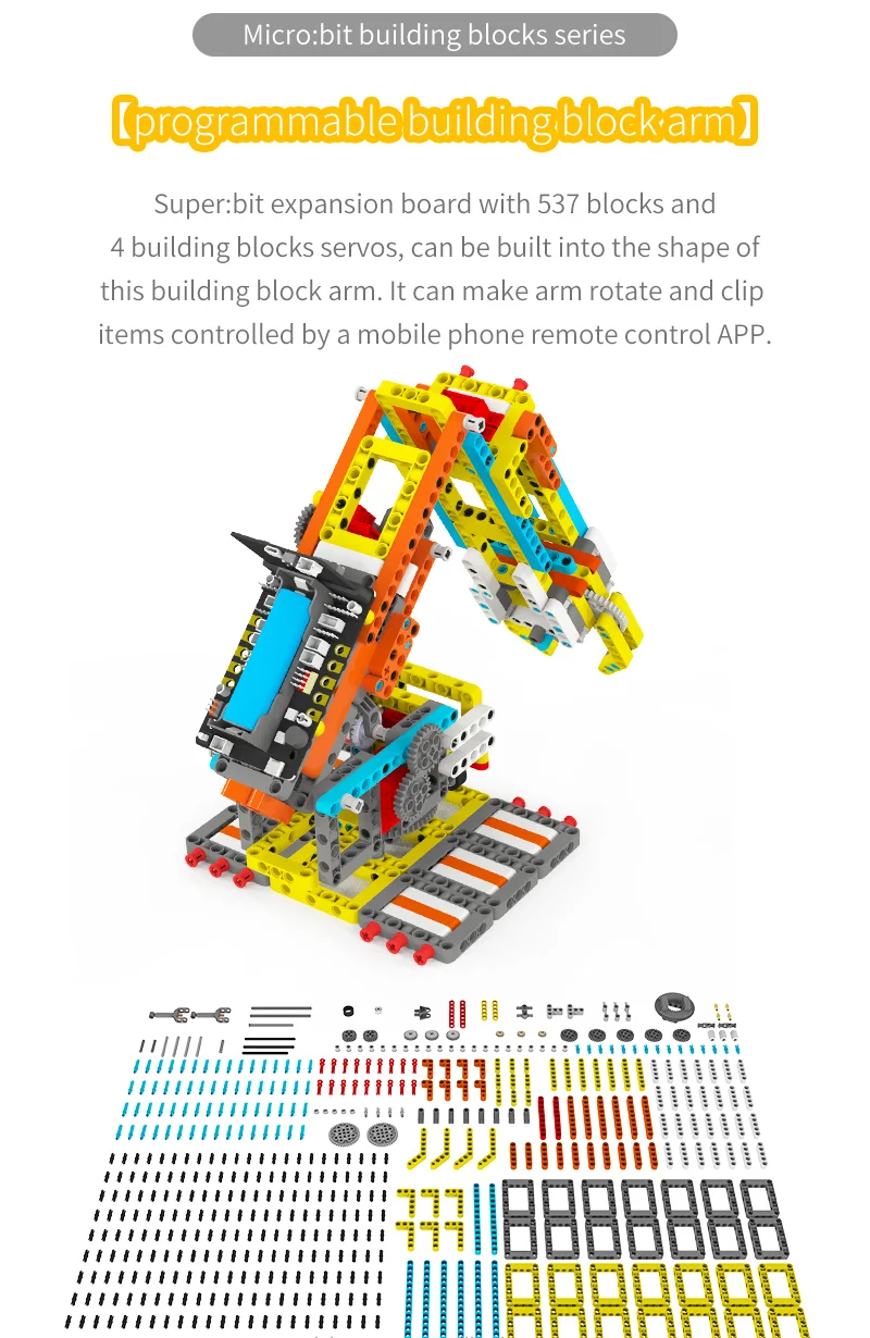Deze Arm:bit is gemaakt van 537 blokken en 4 duurzaam bouwstenen. De gebruiker kan het te voltooien de 4 vrijheidsgraden bediening en halen de items door de android/iOS mobiele APP. Haar grootste kenmerk is dat de basis van Arm:bit keurt anti-wrap ontwerp, die geen invloed op de bedrading van de servo tijdens rotatie; de control board is gelegen in het midden van de Arm:bit, die is mooi en handig te gebruiken; de unieke elektrische duwstang ontwerp verbeteren de flexibiliteit van het. Uitgerust met een multifunctionele super:bit uitbreidingskaart tailored voor micro:bit, dus we kunnen gebruiken Grafische programmering en Python programmeren om de Arm:bit en andere functies van de super:bit uitbreidingskaart, zoals spelen muziek, ademhaling lichten, etc.