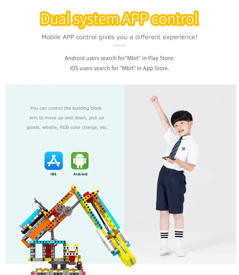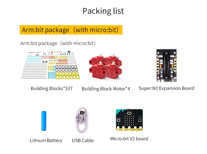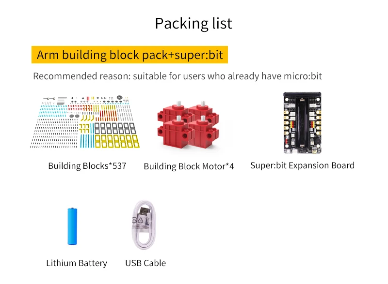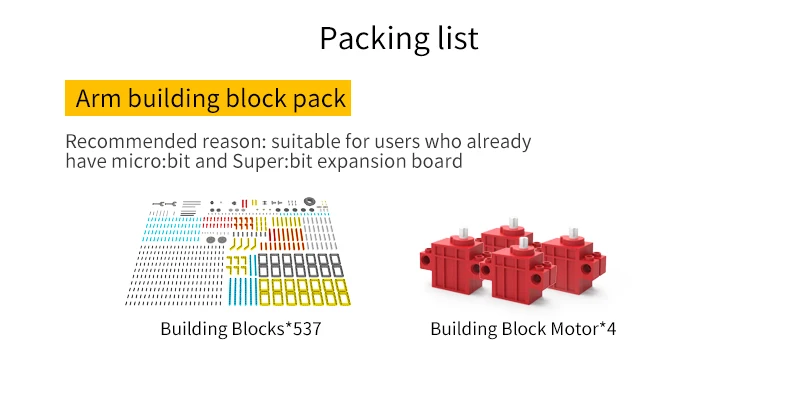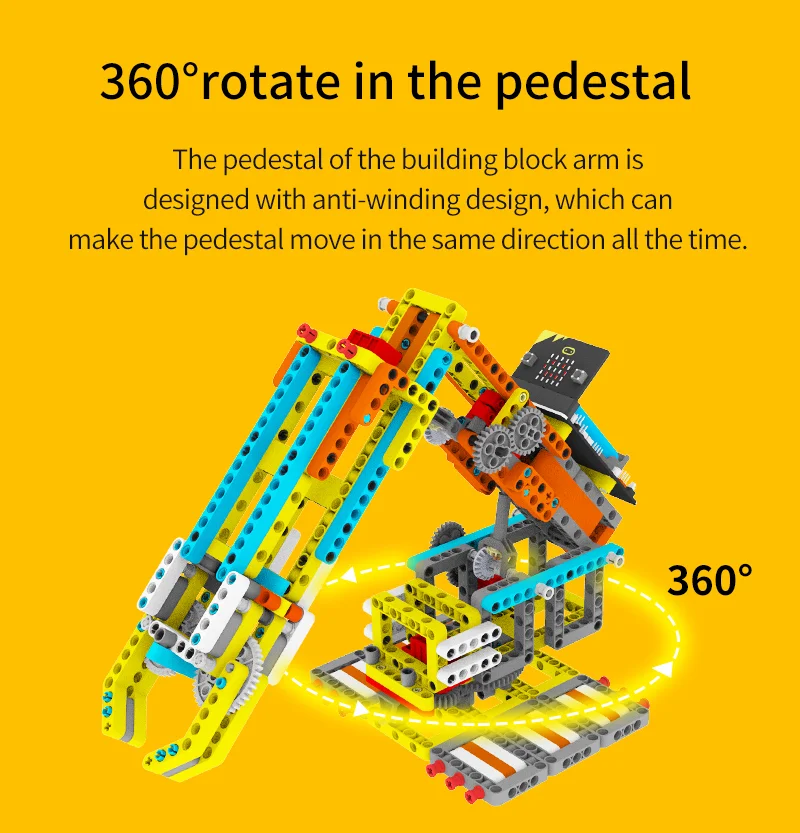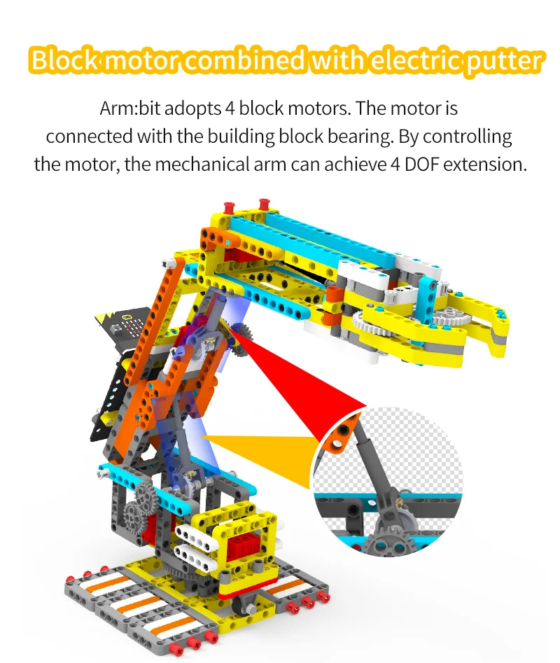 Deze Arm:bit is gemaakt van 537 blokken en 4 duurzaam bouwstenen. De gebruiker kan het te voltooien de 4 vrijheidsgraden bediening en halen de items door de android/iOS mobiele APP. Haar grootste kenmerk is dat de basis van Arm:bit keurt anti-wrap ontwerp, die geen invloed op de bedrading van de servo tijdens rotatie; de control board is gelegen in het midden van de Arm:bit, die is mooi en handig te gebruiken; de unieke elektrische duwstang ontwerp verbeteren de flexibiliteit van het. Uitgerust met een multifunctionele super:bit uitbreidingskaart tailored voor micro:bit, dus we kunnen gebruiken Grafische programmering en Python programmeren om de Arm:bit en andere functies van de super:bit uitbreidingskaart, zoals spelen muziek, ademhaling lichten, etc.