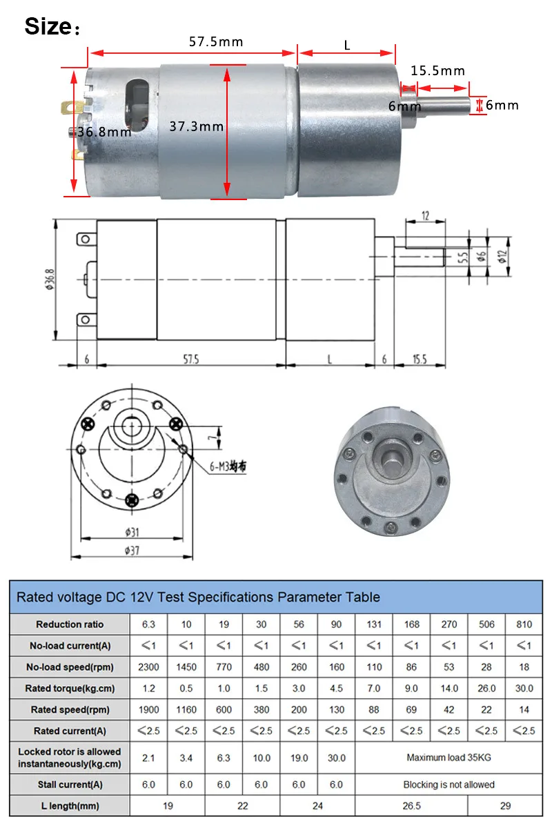 Note: The product has high torque, the starting current of high-power motor is relatively large, the starting current of 12V is about 6A, and the current will return to normal 1-2A after starting, so customers should choose a high-power power supply when purchasing this motor. 12V should be above 10A. Otherwise, the motor will not be able to start. The original speed of the motor is relatively high, the all-metal gear, the sound is too loud, the torque of the motor itself is relatively large, the gear can withstand a maximum of 35KG, please do not block or reverse it instantly.