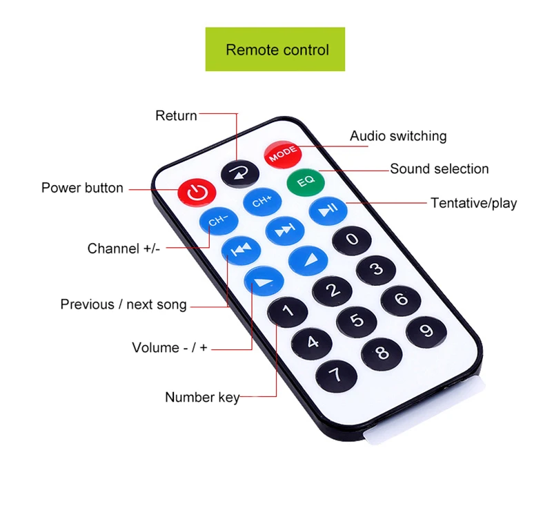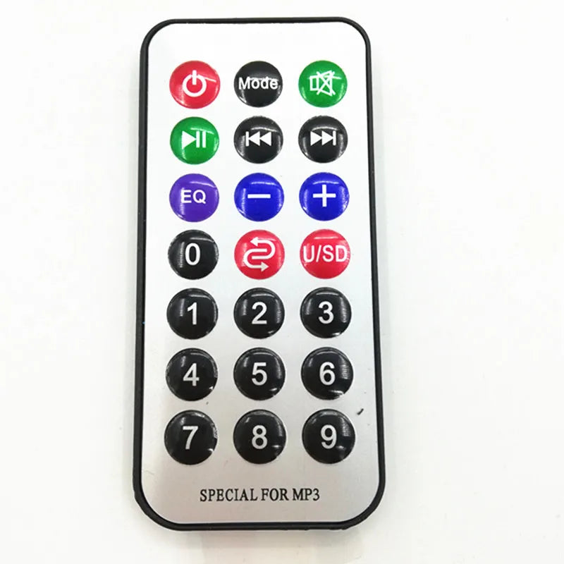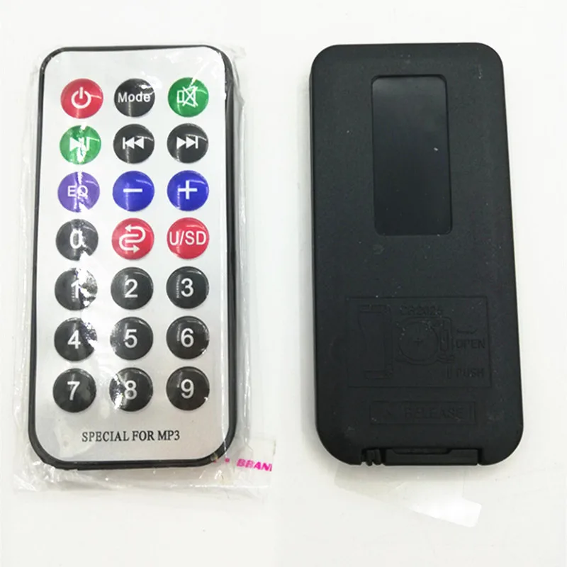 Color: Black Gross Weight: 20g Quantity: 1 pc Size:85*40 mm Features: * Support USB / TF / FM / LINE switching. MP3 / WMA, WAV lossless music decoding chip. * Support USB / TF card switching, PREV, NEXT, fast forward, fast reverse, volume, equalization, play / pause, stop, single repeat, mute, shutdown and direct election. Input voltage: 5-12V Package Included: 1pc* remote control (without battery)