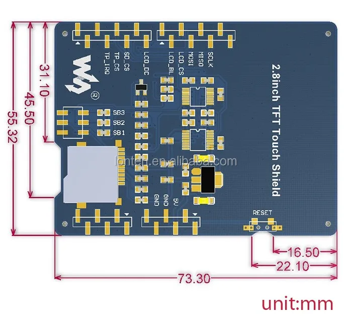 - Resistive touch screen TFT LCD, 2.8 inch, 320×240 resolution