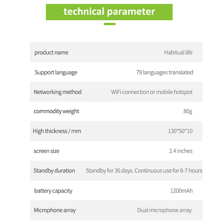 Long standby: 1200mah large capacity battery, standby time 7 days, no anxiety outside going out. No language