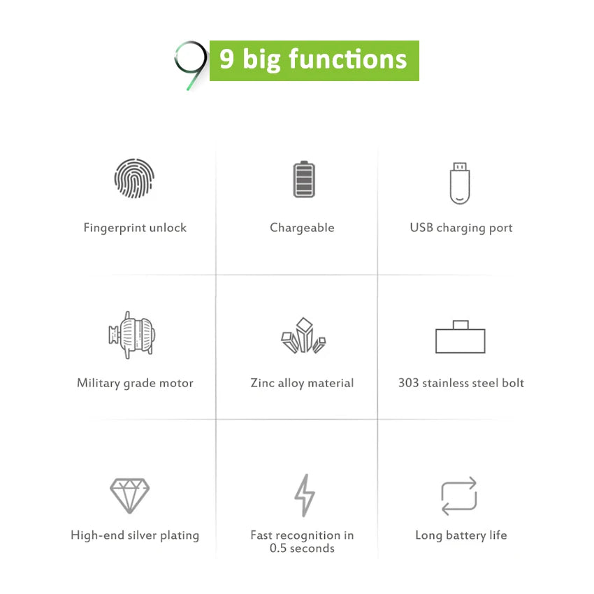 Power usage time: 2 hours of charging for 180 days of continuous use, ten times a day for unlocking