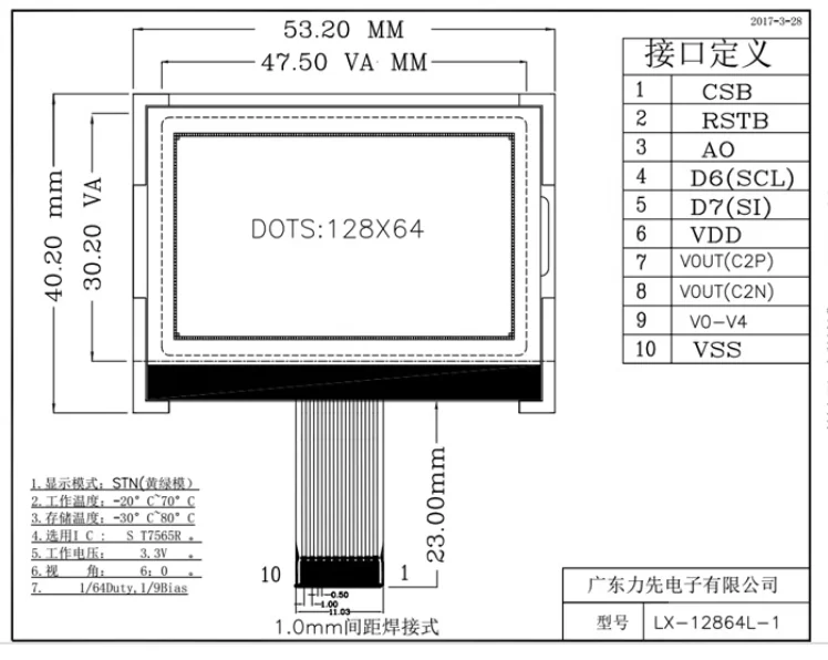 The LX-12864L-1 LCD module produced is widely used in various human-machine communication panels due to its compact, lightweight, convenient use, and clear display. This model can display 128 columns * 64 rows of monochrome images, or display 8 Chinese characters/row * 4 rows of 16 * 16 dots, or display English, numbers, and symbols of 16 Chinese characters/row * 8 rows of 8 * 8 dots. Strong input instructions can be combined into various input, display, and displacement modes to meet different requirements. Low power consumption, with a lifespan of up to 50000 hours (25 ℃). It can be widely used in various instruments, PM2.5 detectors, car driving recorders, POS card readers, attendance systems, access control systems, etc.