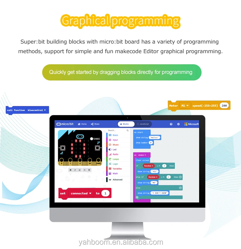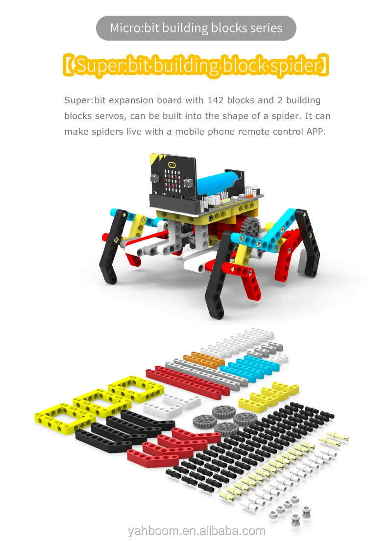 Super:bit uitbreidingskaart met 142 blokken en 2 bouwstenen servo's, kan worden ingebouwd in de vorm van een spin. Het kan spiders live met een mobiele telefoon afstandsbediening APP. U kunt de spider om vooruit en achteruit, draai links en rechts, tweet, RGB kleur veranderen, etc. Super:bit bouwstenen met micro:bit board heeft ook een verscheidenheid van programmering methoden, ondersteuning voor eenvoudig en leuk makecode Editor grafische of Python programmering. Naast de standaard vorm Super:bit bouwsteen spinnen, u kunt ook de ingebouwde bouwstenen bouwen meer interessante vormen, zoals "bouwstenen zwemmen machine". Kunt u laat de "swim machine" keep moving na het starten circuit.