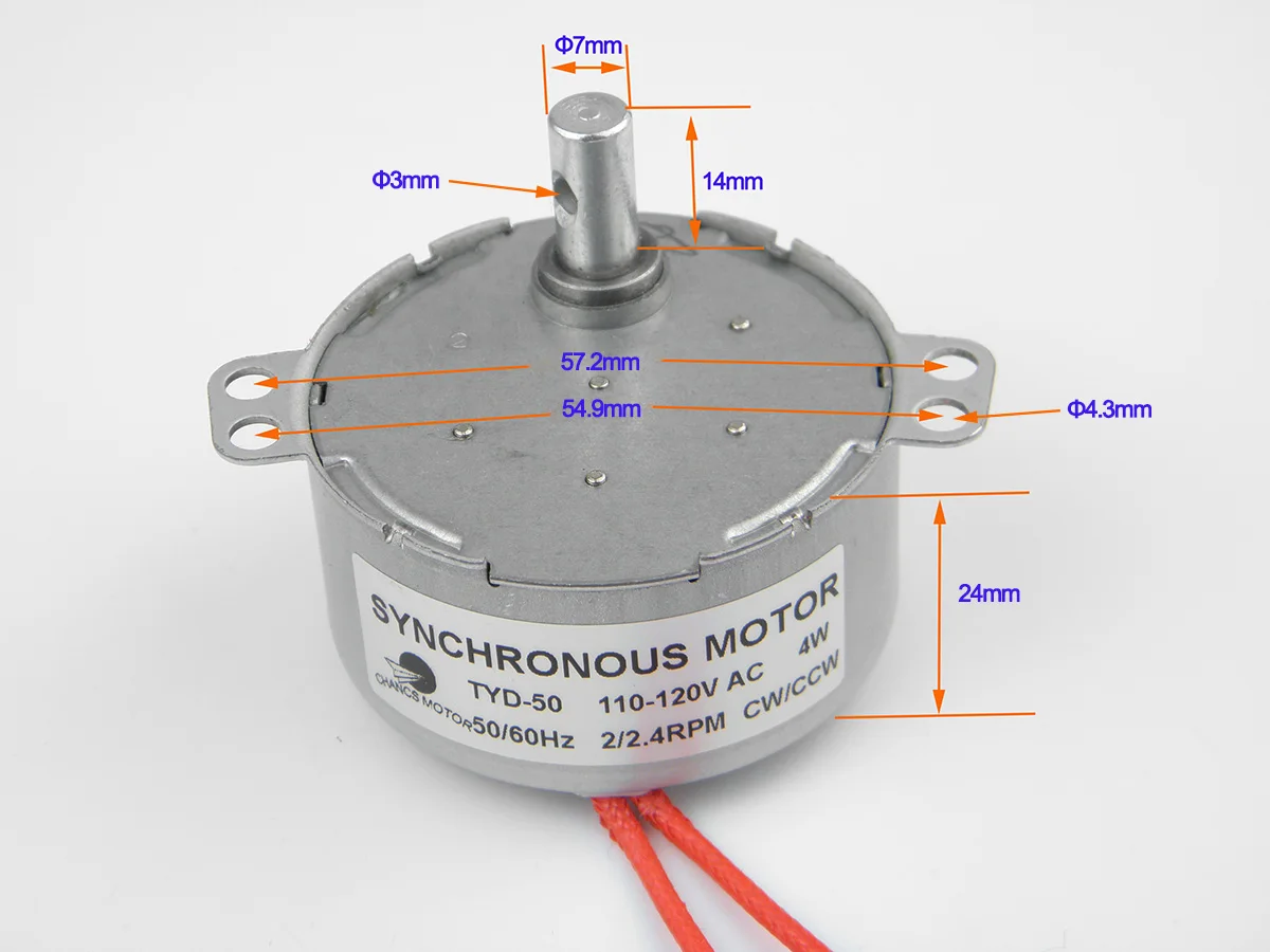 Product Name : Synchronous Motor; Model : TYD-50; Shaft Diameter: 5.5mm ; Shaft Length: 11mm; Direction : CW/CCW(UNCONTROLLABLE); Voltage : AC 110V; Speed : 2.4RPM/min; Power : 4W; Torque:≤12kgf*cm; Frequency : 50/ 60Hz;