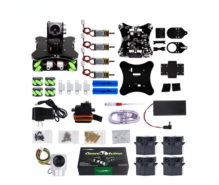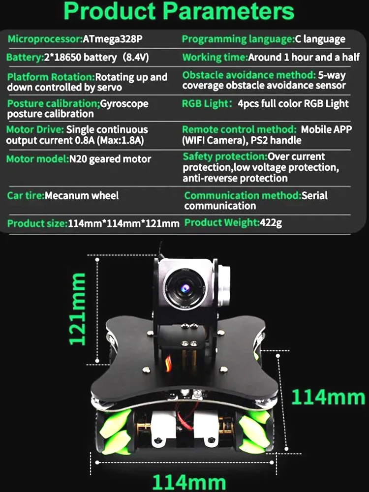 On-board MPU6050 gyroscope , which can automatically calibrates the movement direction of the car through an algorithm. An external WiFi camera PTZ supports iOS / Android mobile APP control and real-time video transmission. It also supports PS2 controller remote control, surround, translation, music light and other funny function.