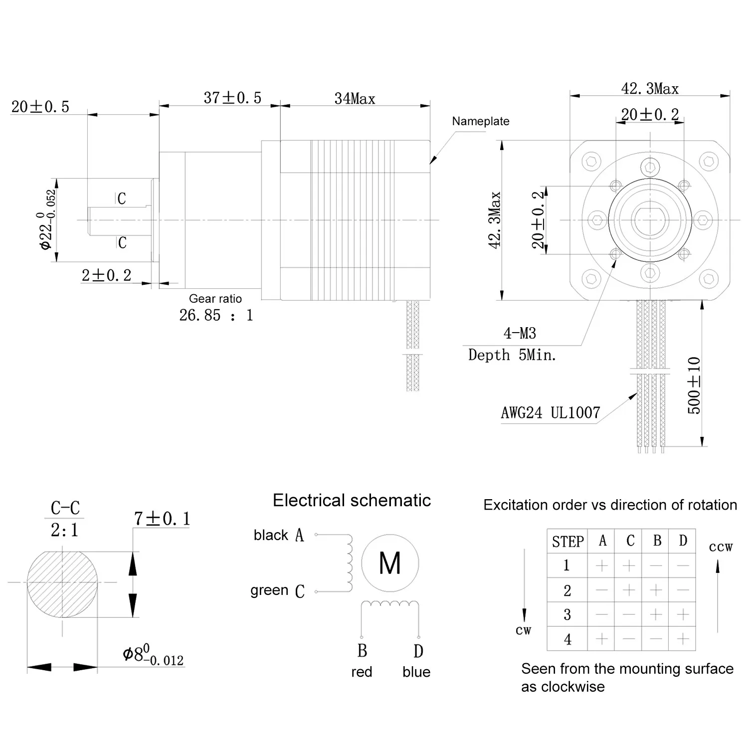 This is a short geared NEMA 17 Stepper motor. It has an integrated planetary gearbox with a 26.85:1 gear ratio, the resolution reach 0.067°step angle. It's a good solution in applications that need very low rotation speeds and/or lots of torque.