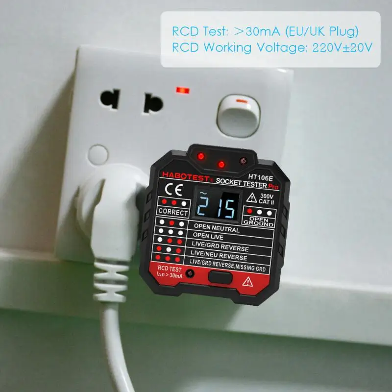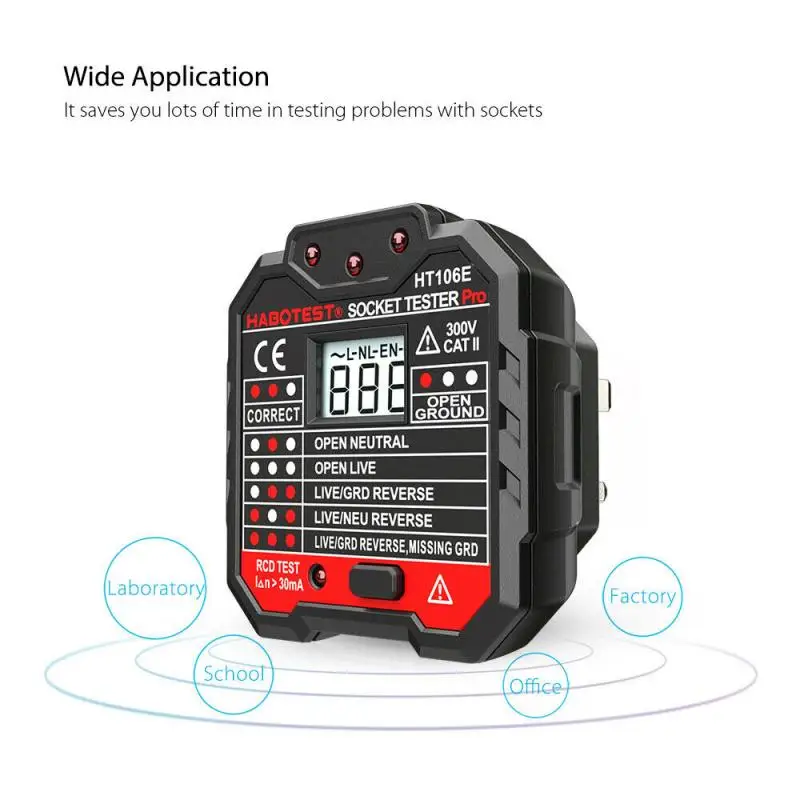 Socket tester is mainly used for power socket wiring detection and RCD test. It can detect the wiring status of the socket quickly and accurately.